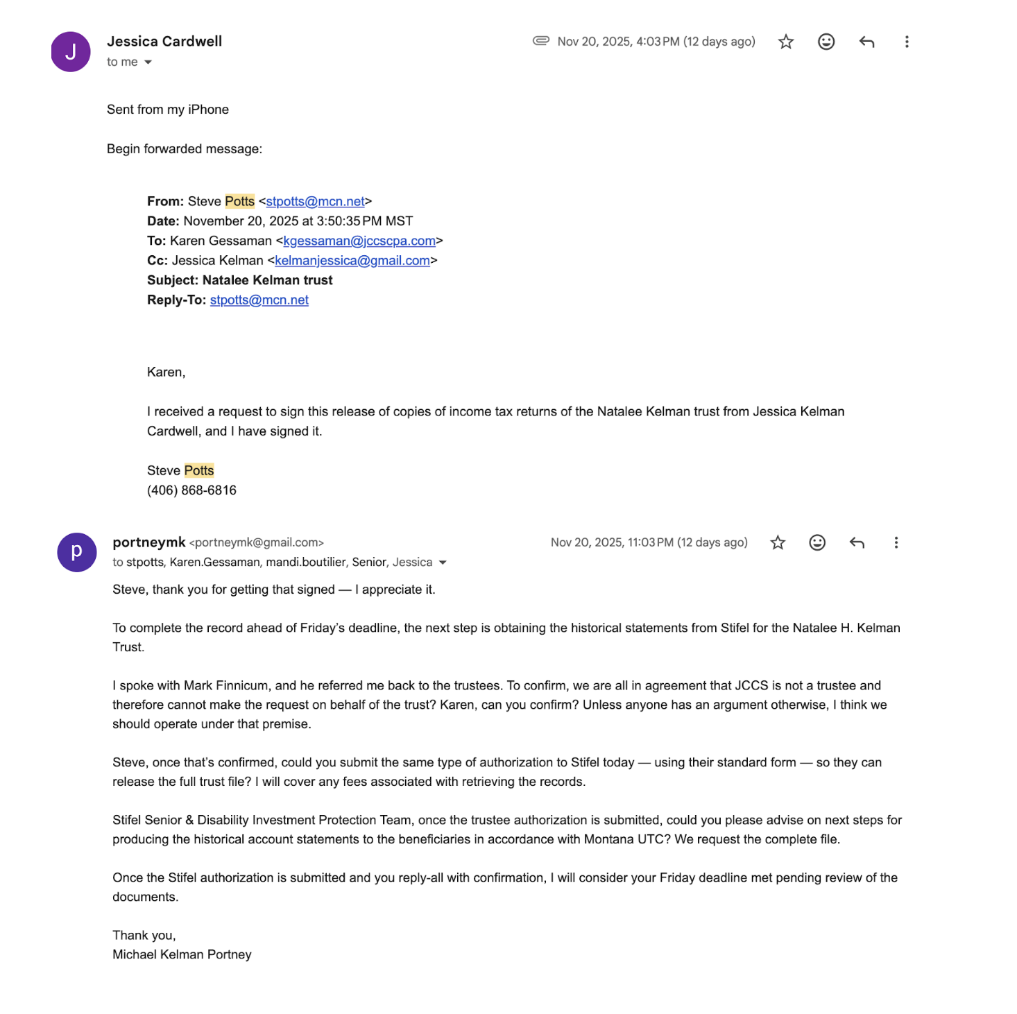 “Steve, thank you for getting that signed — I appreciate it. To complete the record ahead of Friday’s deadline, the next step is obtaining the historical statements from Stifel for the Natalee H. Kelman Trust. Steve, once that’s confirmed, could you submit the same type of authorization to Stifel today — using their standard form — so they can release the full trust file?”